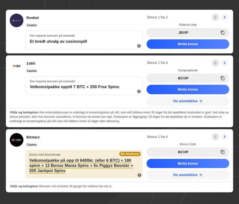 Disse tilbudene er de som vi mener er beste og her er det en sammenligning av de beste casinobonusene.